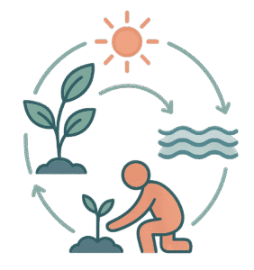 Beyond care for people, permaculture also offers an ethics of care for the Earth and of Fair Share — a call to restore balance within living systems. This perspective gives me a broader framework within which to practice Ayurveda. It invites me to think not only about the health of the person in front of me, but also about the health of the ecosystems and social environments that sustain them: the soil that nourishes their food and medicine, the communities that shape their resilience. It also reminds me to see plants not as resources, but as participants in a vast conversation of energy and exchange.